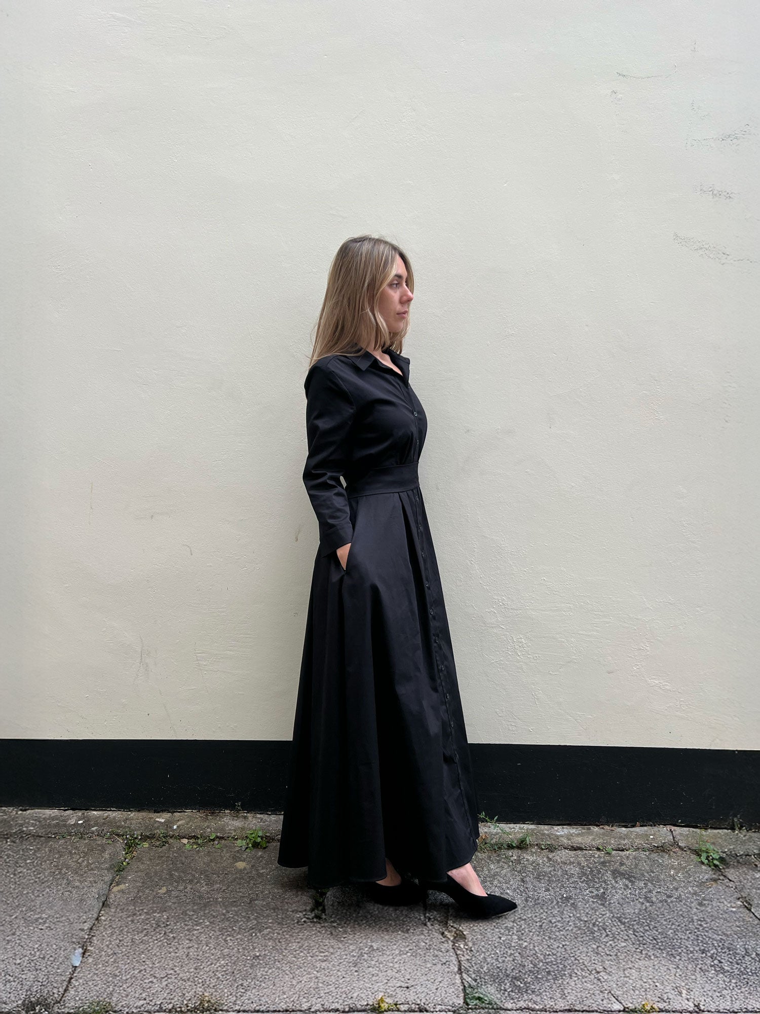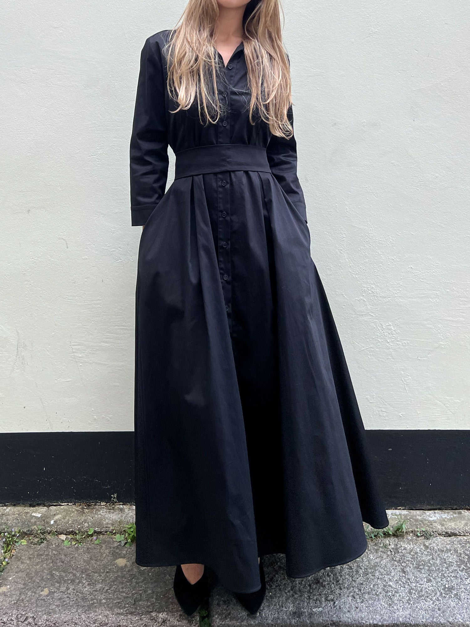 This Raluca Mihalceanu long shirt dress has an effortlessly sophisticated silhouette and is perfect to style in the summer. It comes with a belt to cinch the waist and a detachable fabric rose pin. It combines a full-length button down with a long flowy skirt, bringing a perfect balance between structure and fluidity.