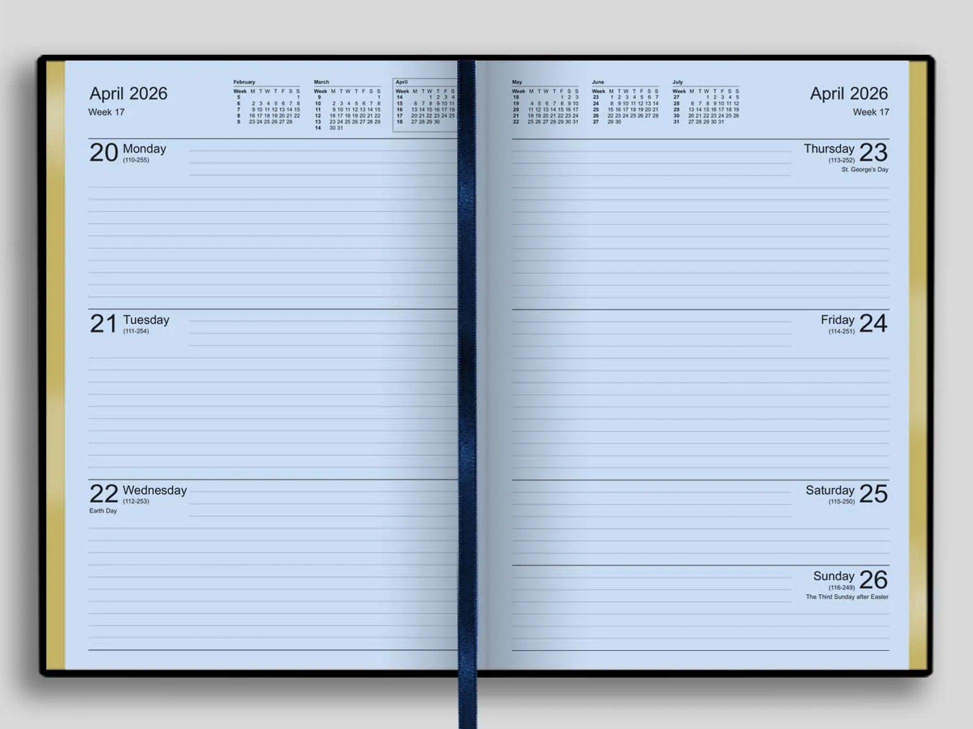 This stylish desk diary features full reference pages of year planners, travel information, conversion tables, notable dates, international holidays and a wine vintage chart.