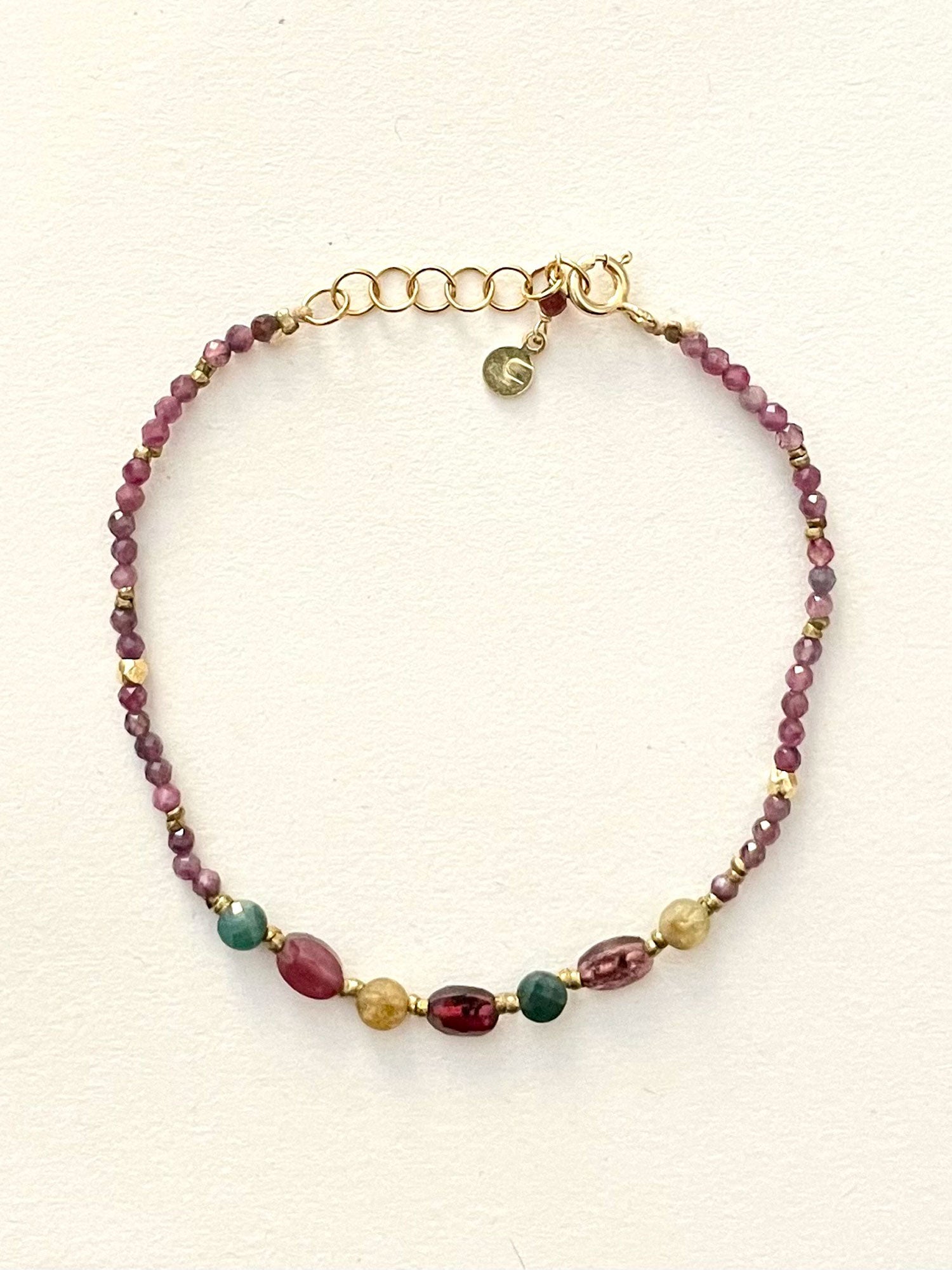 The Mirtillo bracelet by Untitledition features a delicate harmony of violet tourmaline, garnet, green garnet, and blue tourmaline, creating a refined play of color inspired by natural beauty and timeless craftsmanship.