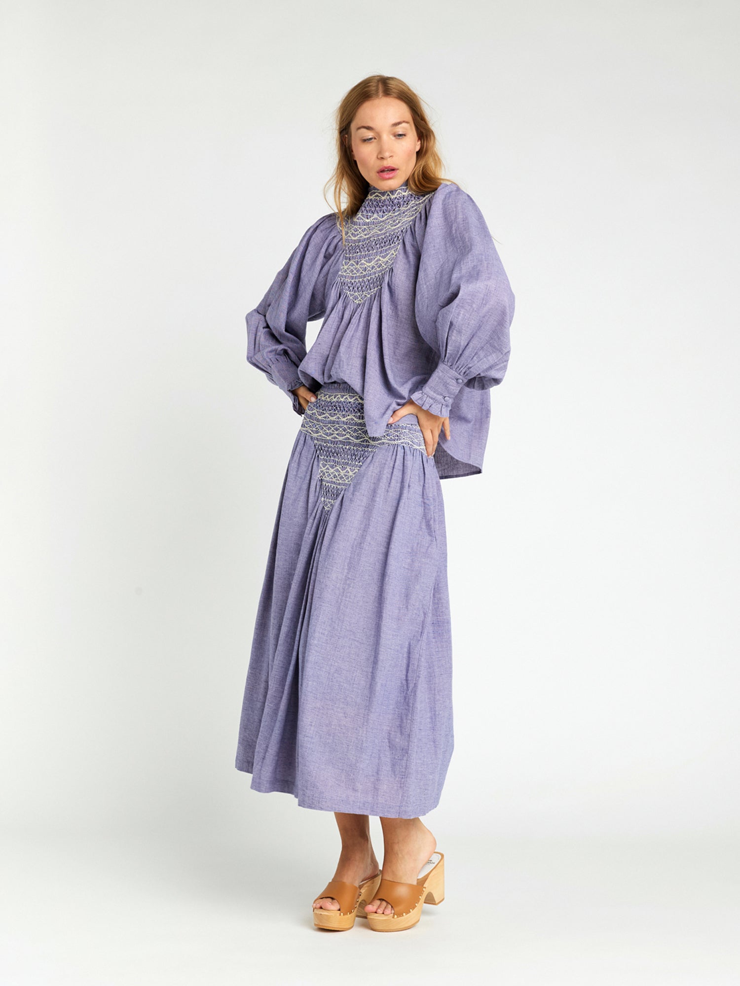 Cette jupe V de Vinster est en 100 % coton. Elle est de longueur midi et de coupe trapèze, et présente des fronces en forme à la taille.