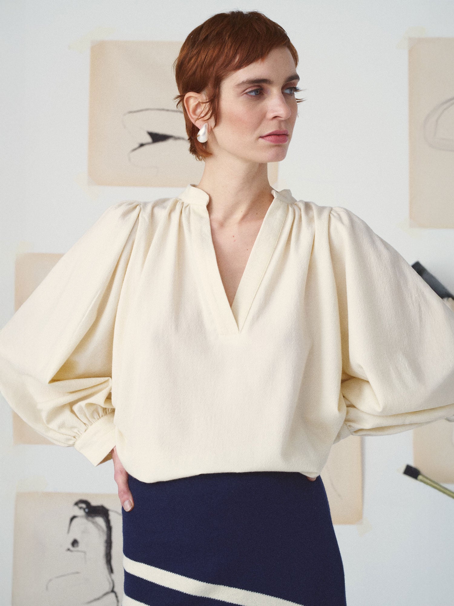 Crafted in soft wool, the Claudia shirt features a relaxed, voluminous silhouette for effortless comfort and ease. A gently cinched neckline and cuffs add a touch of femininity, making this timeless piece a must-have for any wardrobe.