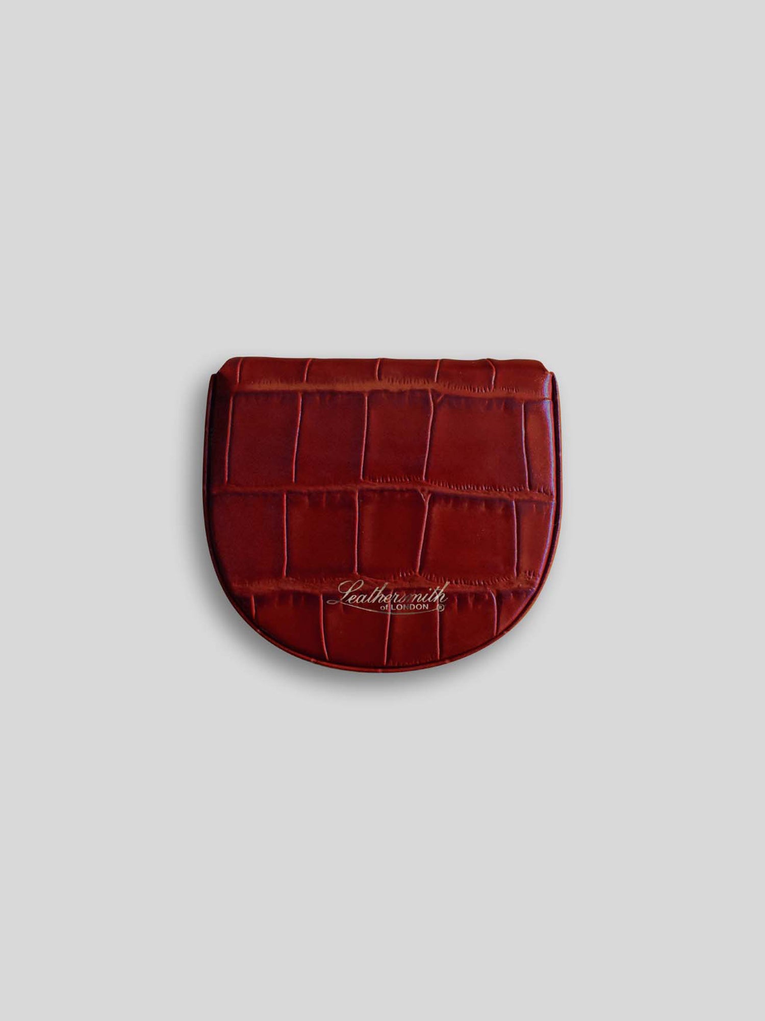 A Luxurious coin purse is made from leather with a croc motif; it features interior tray to view coin selection and a separate internal compartment. its unique shape fits comfortably in the hand.