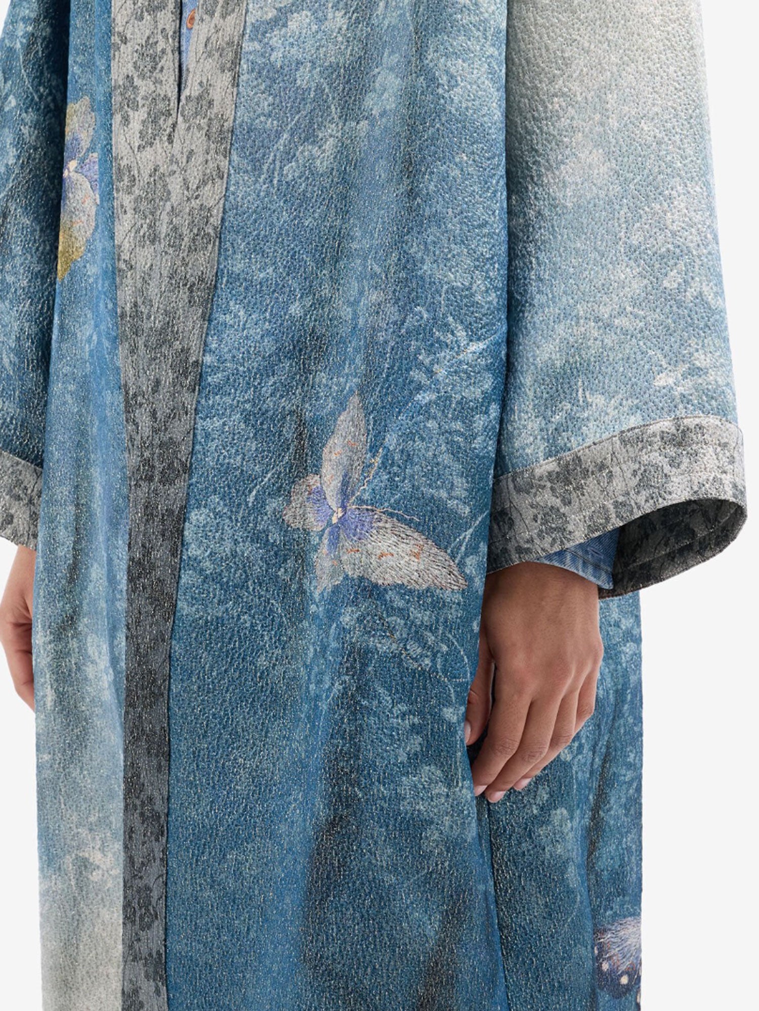 From Pierre-Louis Mascia, the Kimono Jacket Lurex Floral features a fluid, oversized silhouette inspired by traditional kimono shapes. Crafted in a refined wool blend, it is adorned with serene blue tones and delicate butterfly motifs that evoke a dreamlike elegance. Intricate borders frame the design, adding depth and contrast, while its effortless drape makes it ideal for layering over minimalist silhouettes.
