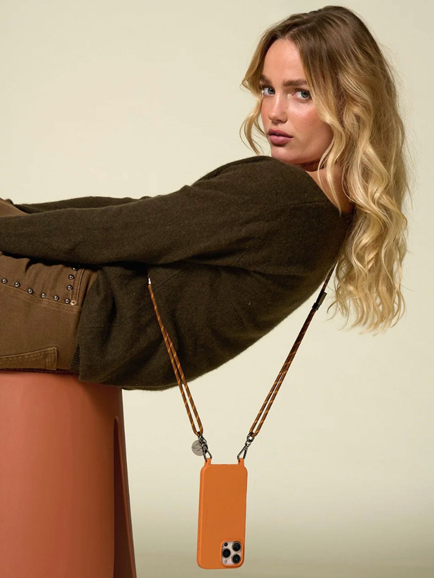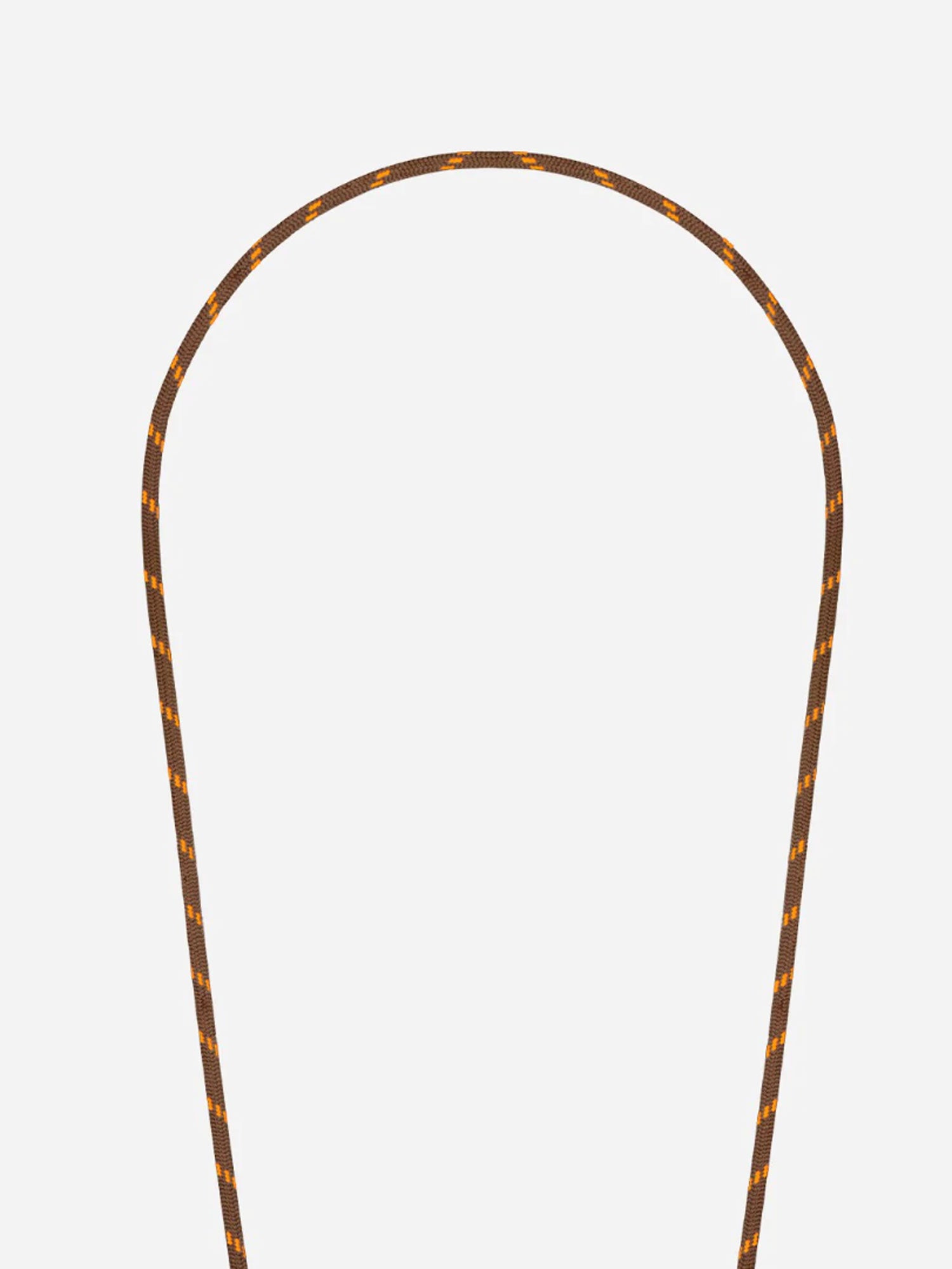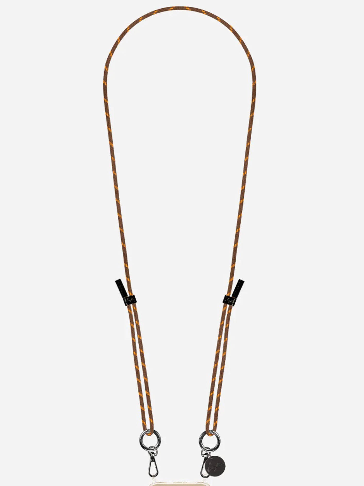 The Liam strap features a braided cotton cord in warm brown and orange, paired with sleek metallic black carabiners. A modern and stylish accessory, it combines playful texture with functional elegance. Clip it onto our ring cases or adapters to keep your phone close.