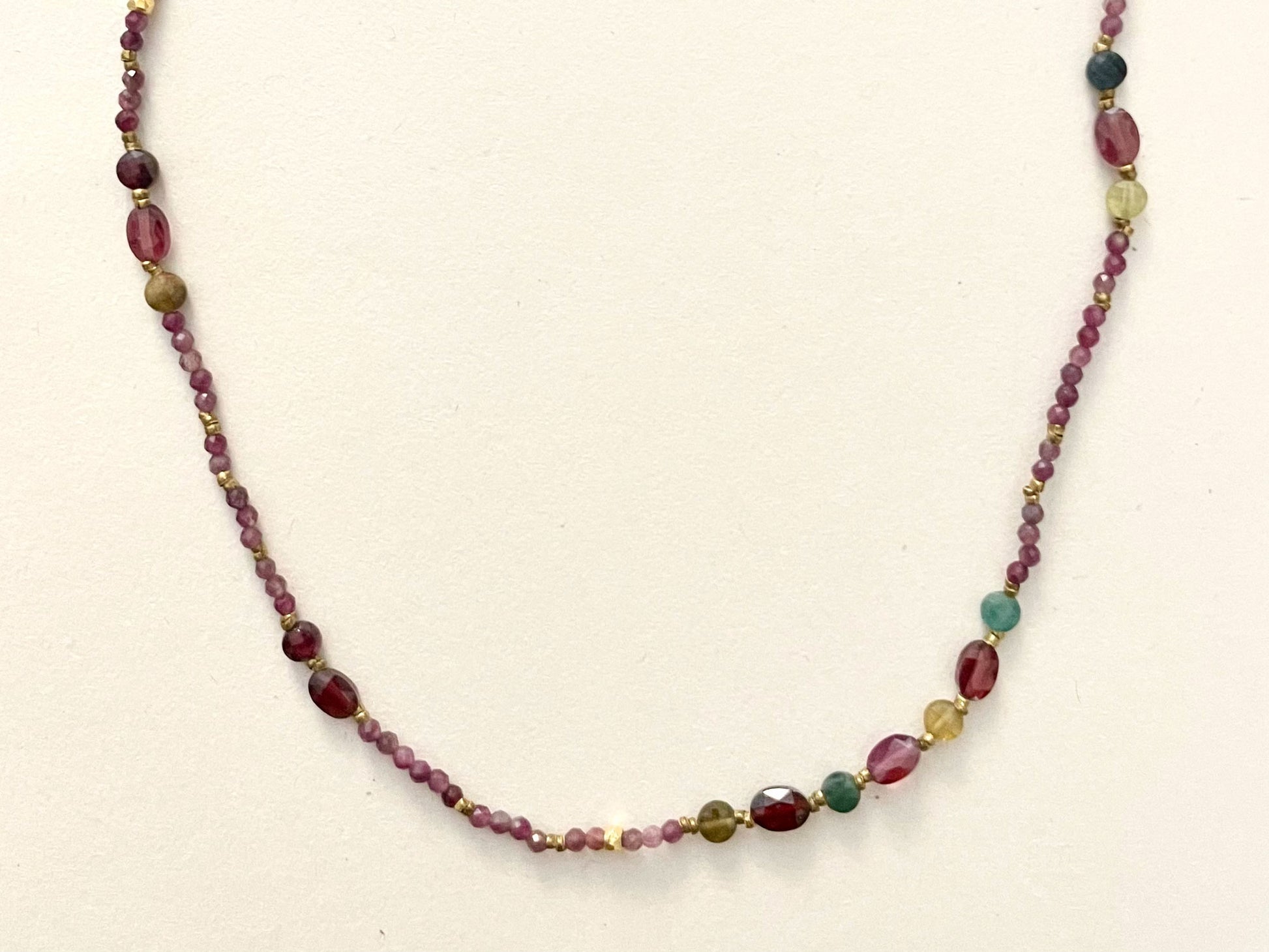 The Myrtillo necklace by Untitledition features a delicate harmony of violet tourmaline, garnet, green garnet, and blue tourmaline, creating a refined play of color inspired by natural beauty and timeless craftsmanship.