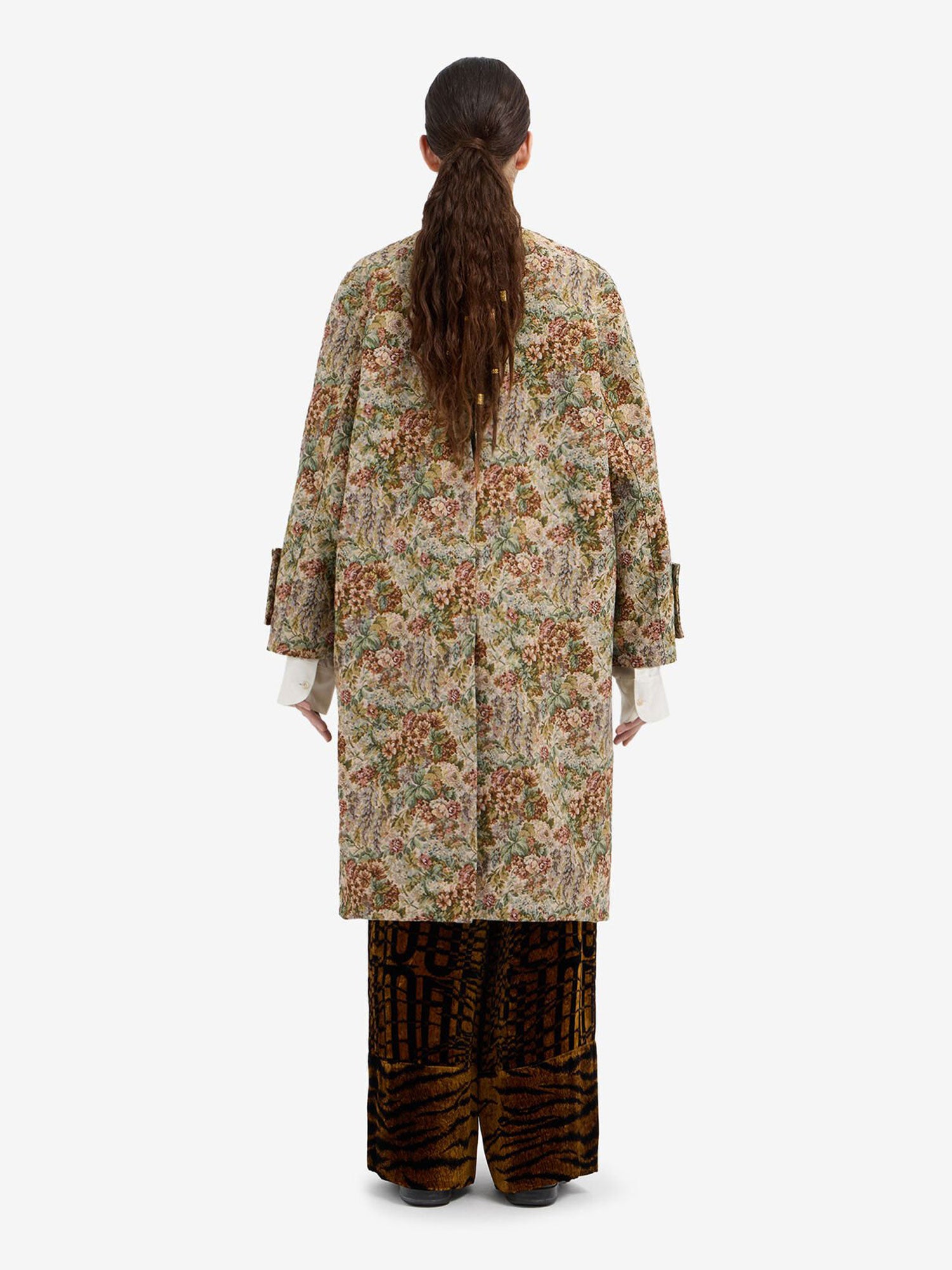 The RIDOX coat by Pierre Louis Mascia captures the romance of vintage tapestries in a modern silhouette. Crafted in structured jacquard cotton, it features muted floral motifs in sage, mauve, and rust, accented with ornate gold buttons and wide cuffs. Refined yet versatile, it layers beautifully over tailoring or printed silks that are a signature expression of the brand’s poetic elegance.