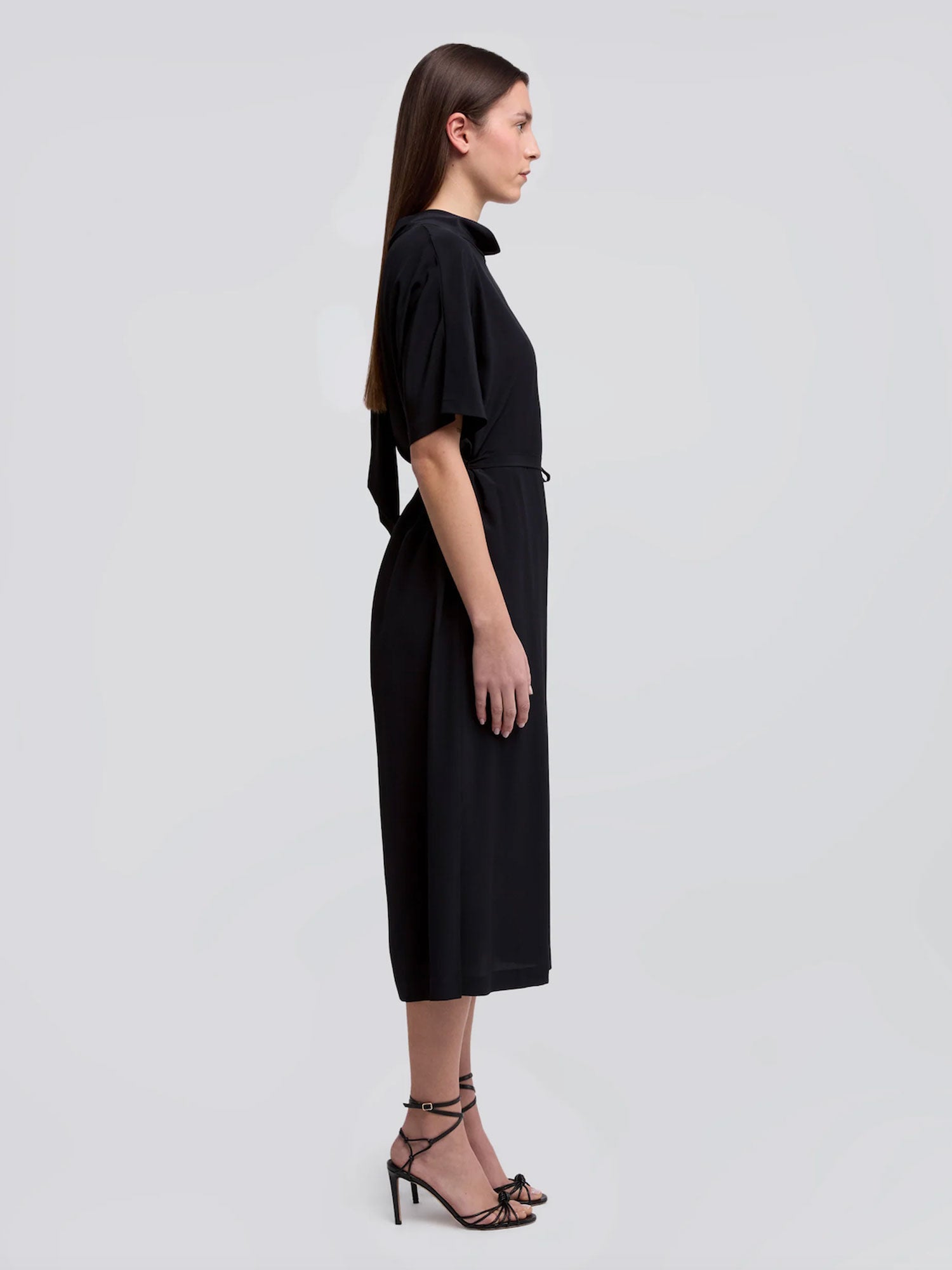 From Aspesi, this Abito dress is crafted in lightweight silk crepe de chine, featuring a loop neckline secured with a bow at the back. The short kimono sleeves and subtle side slits create a relaxed, elegant silhouette, while the removable ribbon belt allows for a tailored, cinched finish.