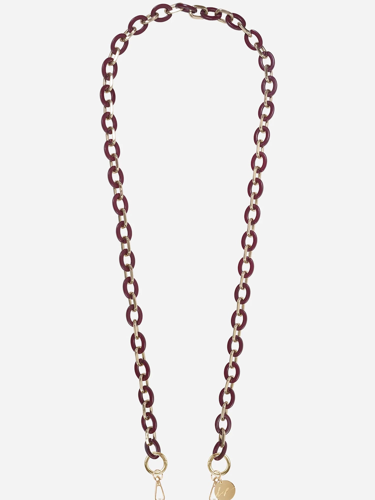 Classy, long phone chain with bordeaux and gold hardware including rotatable gold carabiners perfect to pair with La Coque Francaise phone cases.