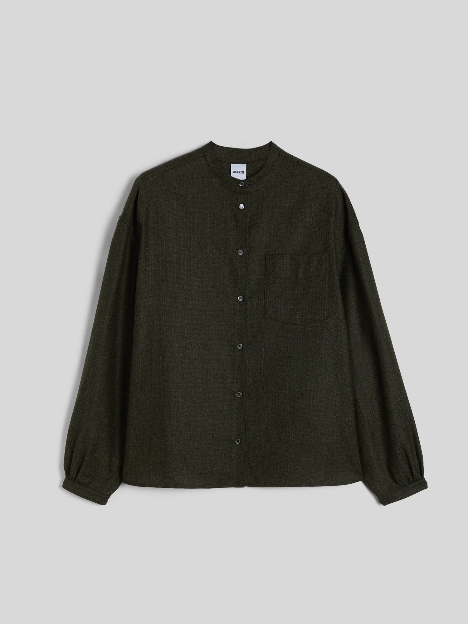 A timeless khaki shirt in a classic cut, crafted from a luxurious wool-blend flannel, technical fabric, and solid-colour cashmere with a subtle slub texture. The design features a refined mandarin collar, practical front button fastening, and a chest patch pocket. Long, softly dropped sleeves are finished with buttoned cuffs accented by delicate ruching, while the back yoke with central ruching and a rounded hem complete this sophisticated piece.