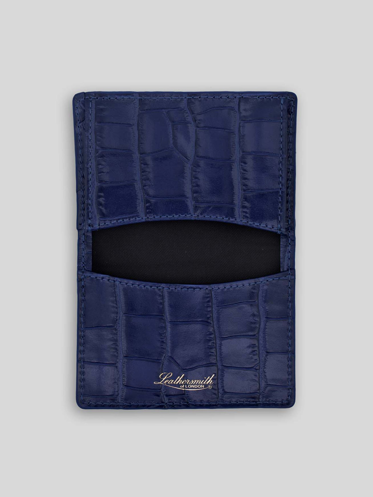 A folding leather business card holder with gusseted and flat pockets, it is bound in Rutland grained leather and finished with a cotton lining.