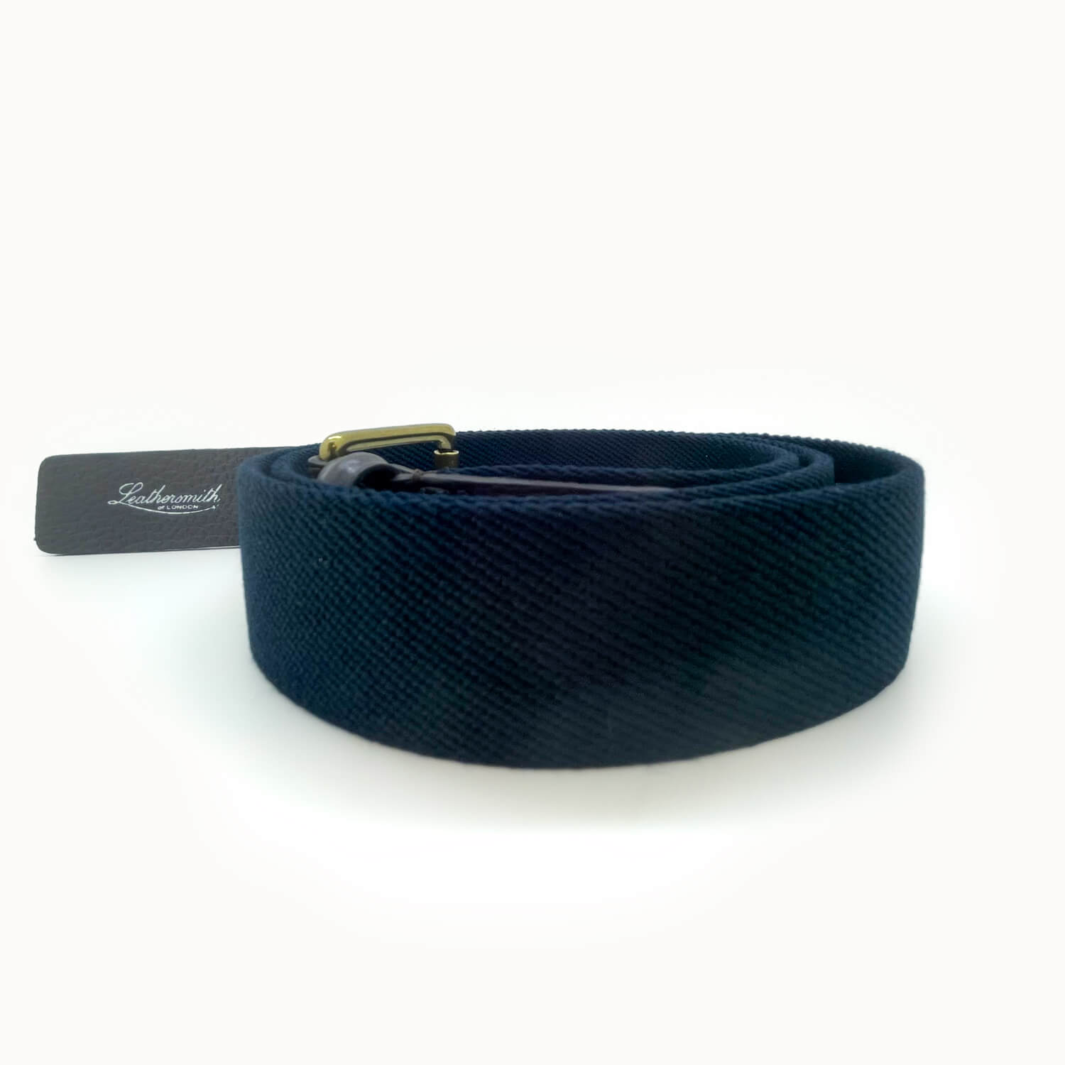 Men's belt in navy with leather trim and brass buckle.