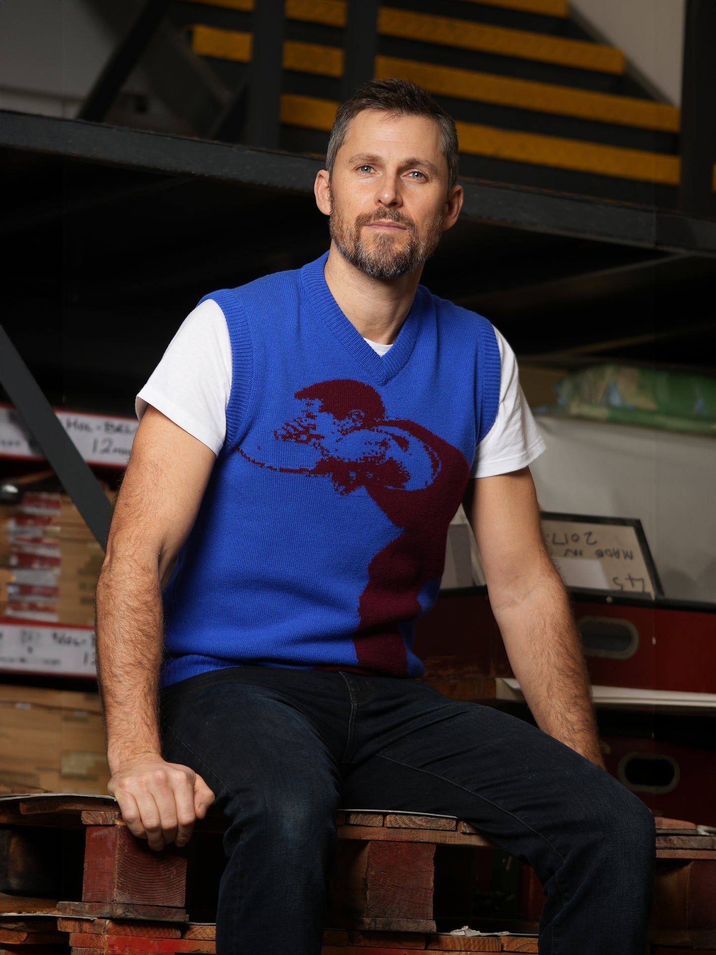 Leathersmith of London slipover vest is made of 100% wool and it comes in cobalt blue with a boxer print. The vest features a v-neck line and fits true to size.