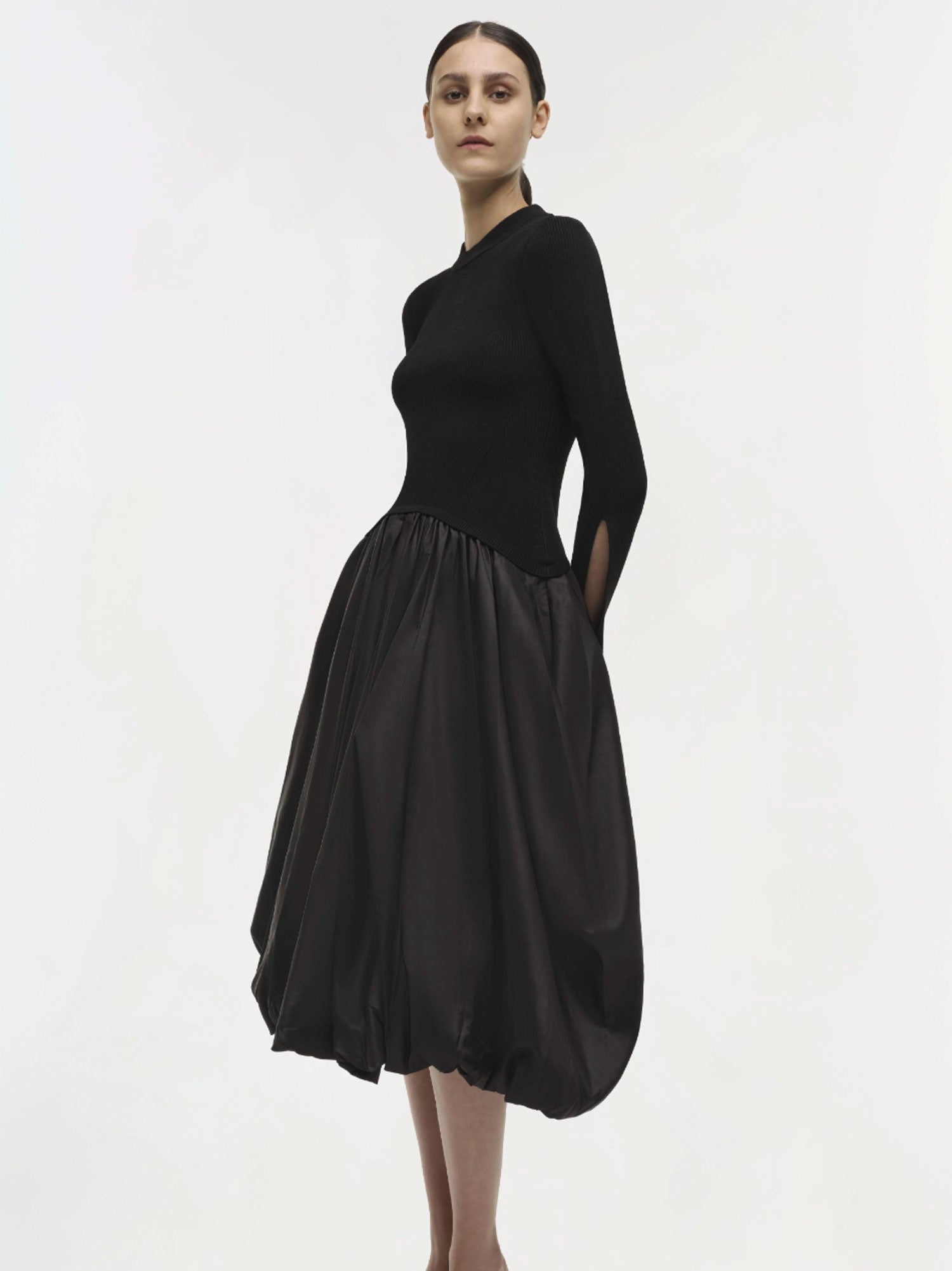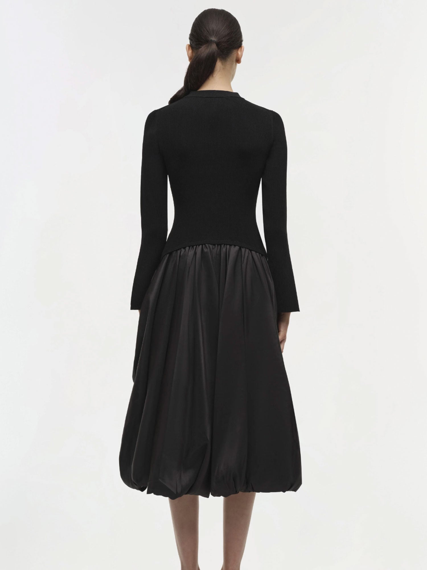 The Kenlie Dress in black features a long-sleeved, mock-neck design with a sculpted bodice and a flowing, gathered midi skirt. The contrast between structure and volume creates a distinctive silhouette, making this piece a refined statement for any occasion.
