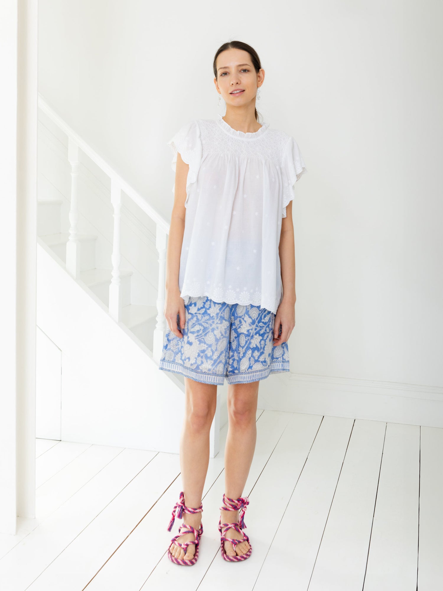 This Bonté loose fitting hand-smock fronted top with a button back opening embodies the essence of femininity as the frill detailed neckline and embroidered boarded sleeves flutter over the shoulder that forms a cap sleeve. Best worn hanging over to show the embroidered details along the hem.