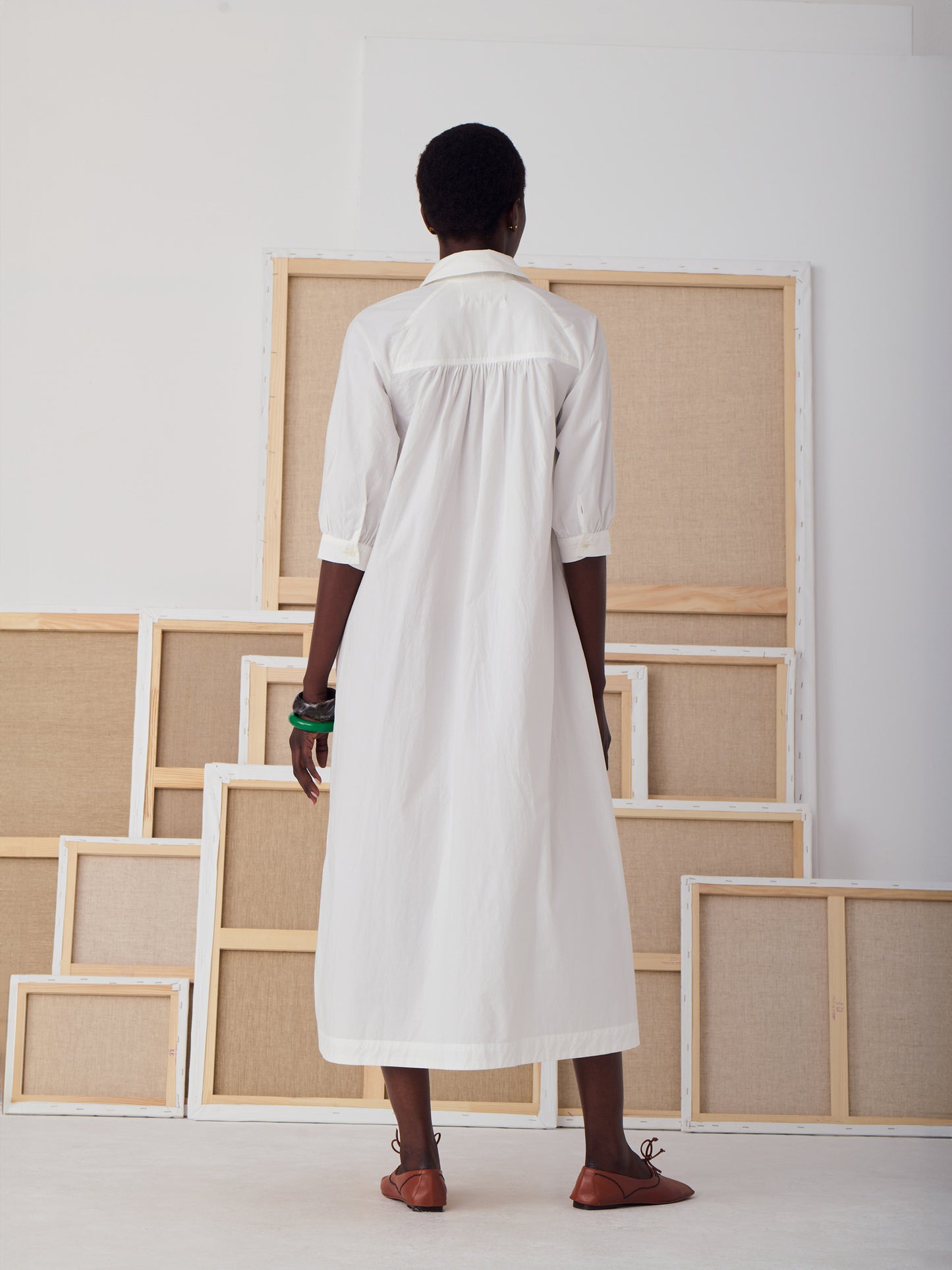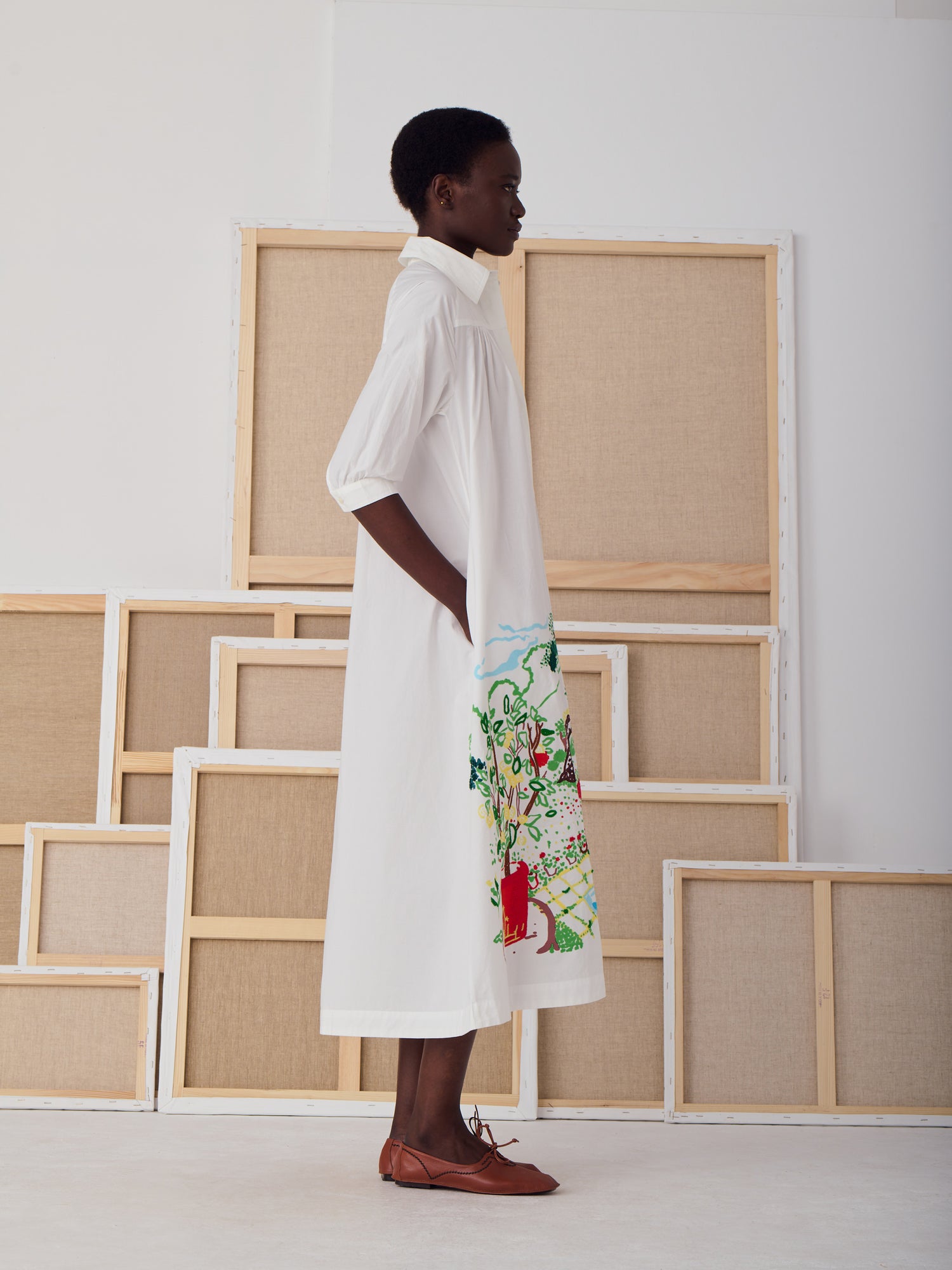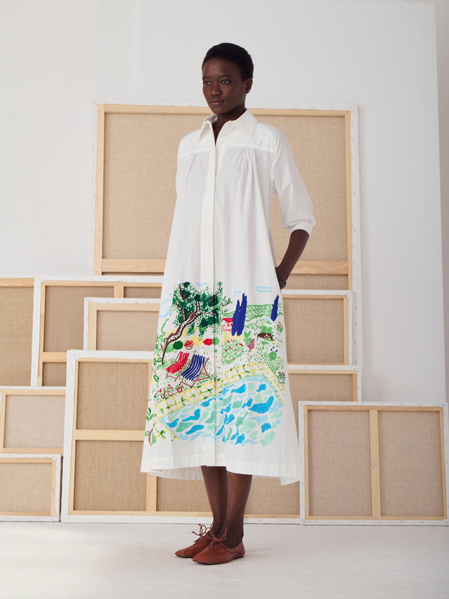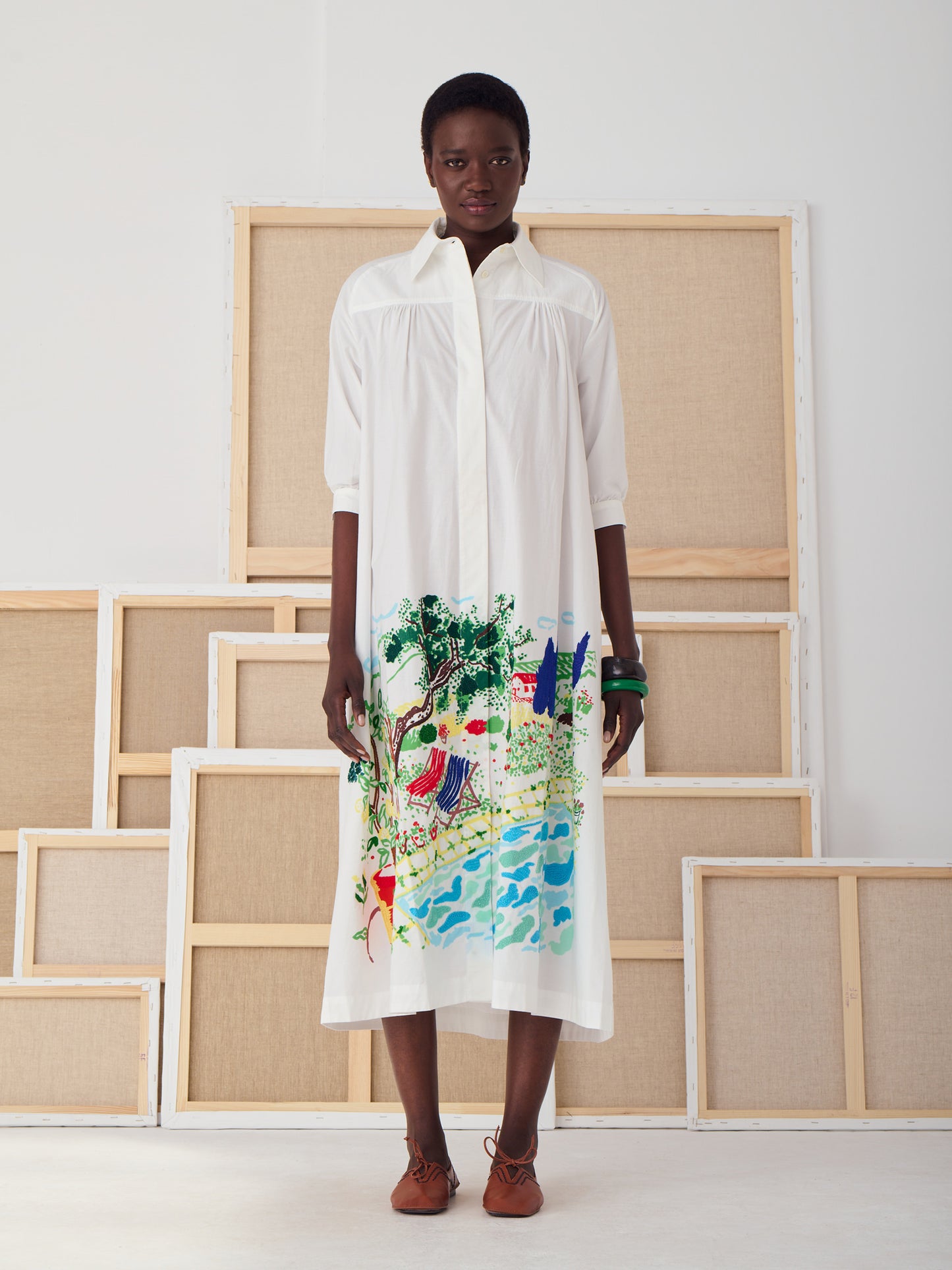 Mii Collection Niki is a loose fitting, a-lined long shirt dress. It features hidden placket with button closure, collar, yoke with pleat detail and elbow length sleeves. This season it comes with a playful, painterly print of pool in the garden.