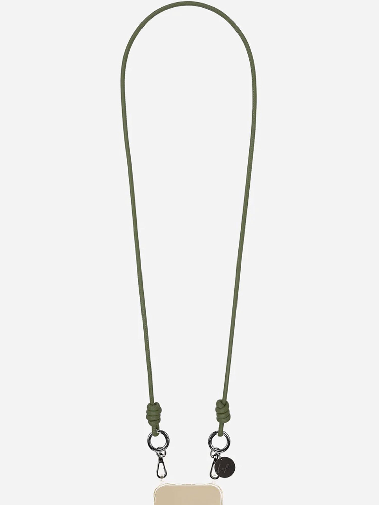 Our Nolan phone cord, in khaki vegan leather, 120 cm long, clips onto our ring cases or our adapter using its gold carabiners.