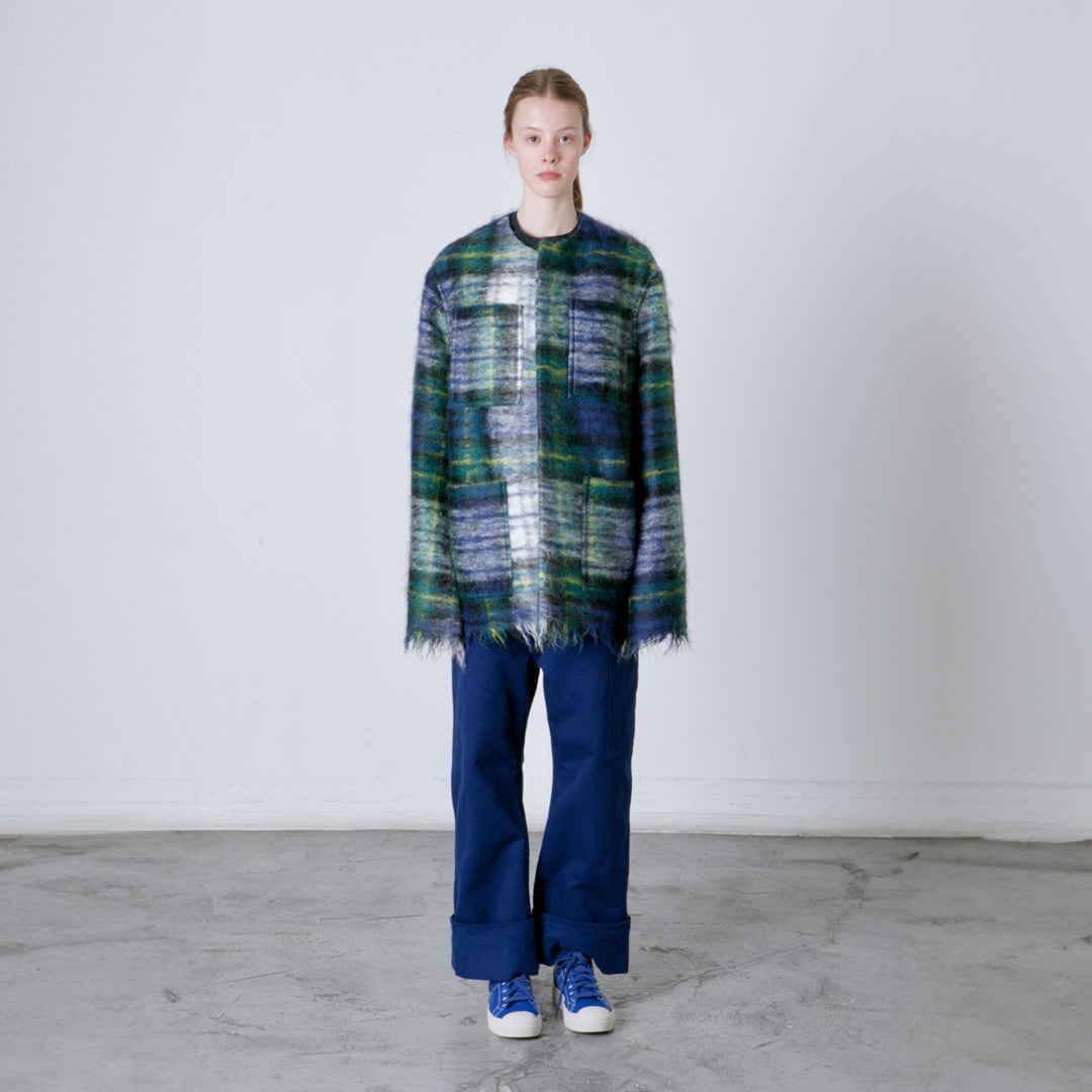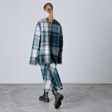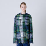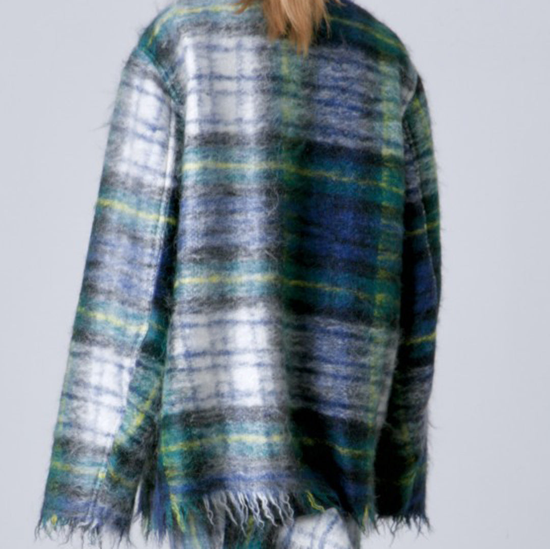 Sofie D'Hoore tartan coat made from mohair blend. This coat is textured, and features tartan check pattern, round neckline, open front, dropped shoulder, four front patch pockets and frayed hem line.