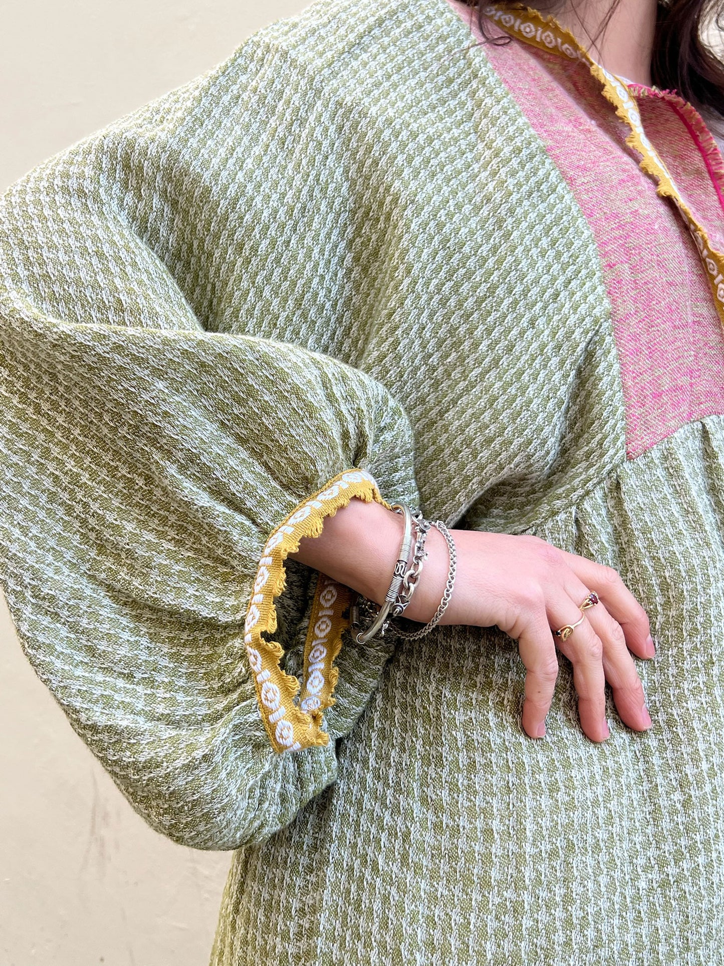 The wide, billowy sleeves add a sense of movement and grace, while the delicate trims enhance its bohemian allure
