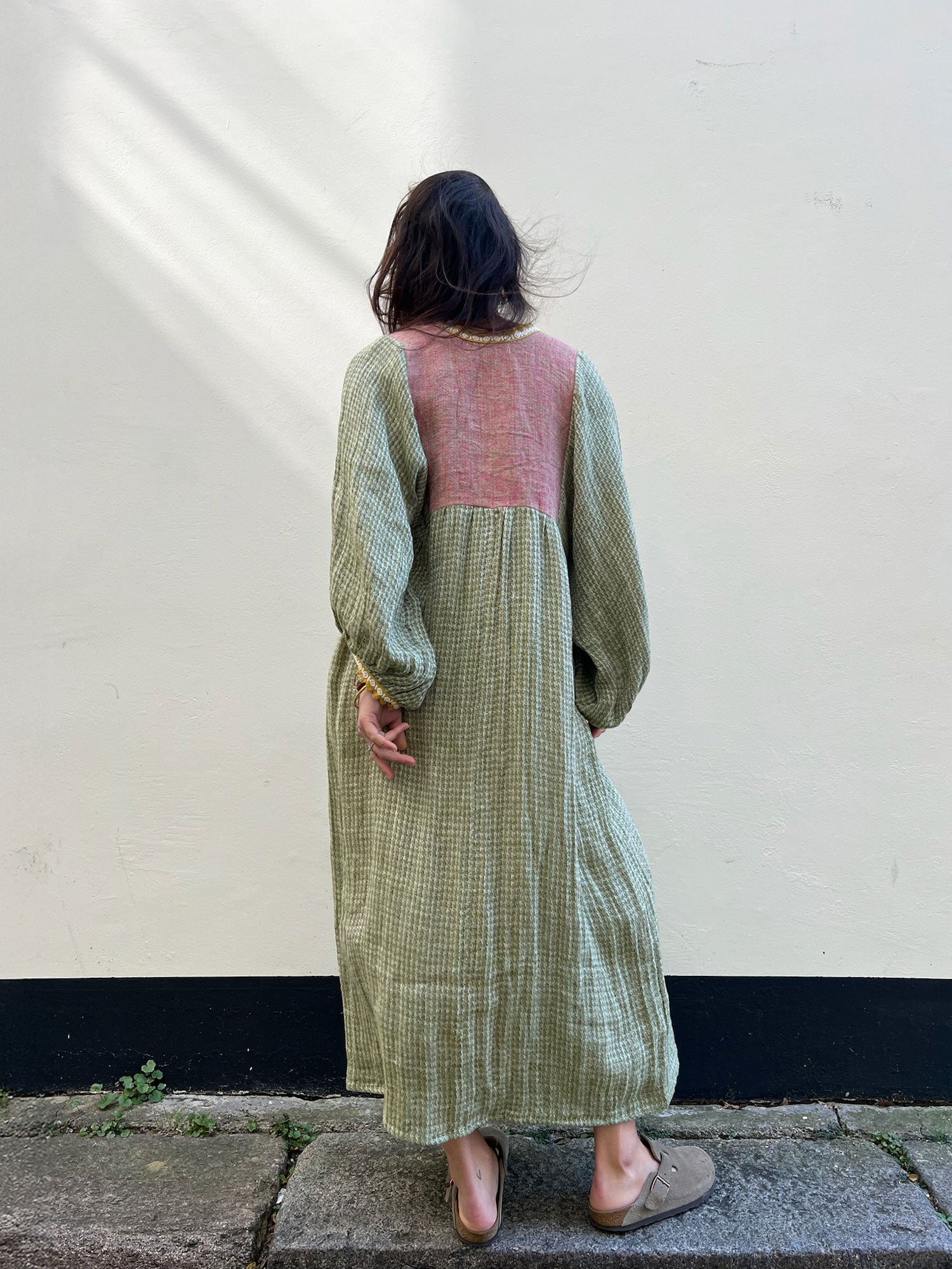 This Nina Leuca Zefiro Maxi Dress embodies relaxed sophistication. Its flowing silhouette features a soft green woven fabric, beautifully contrasted by a delicate pink loom-woven top. Accented with intricate yellow embroidery and charming tassel details, this dress blends artisanal craftsmanship with effortless wearability.